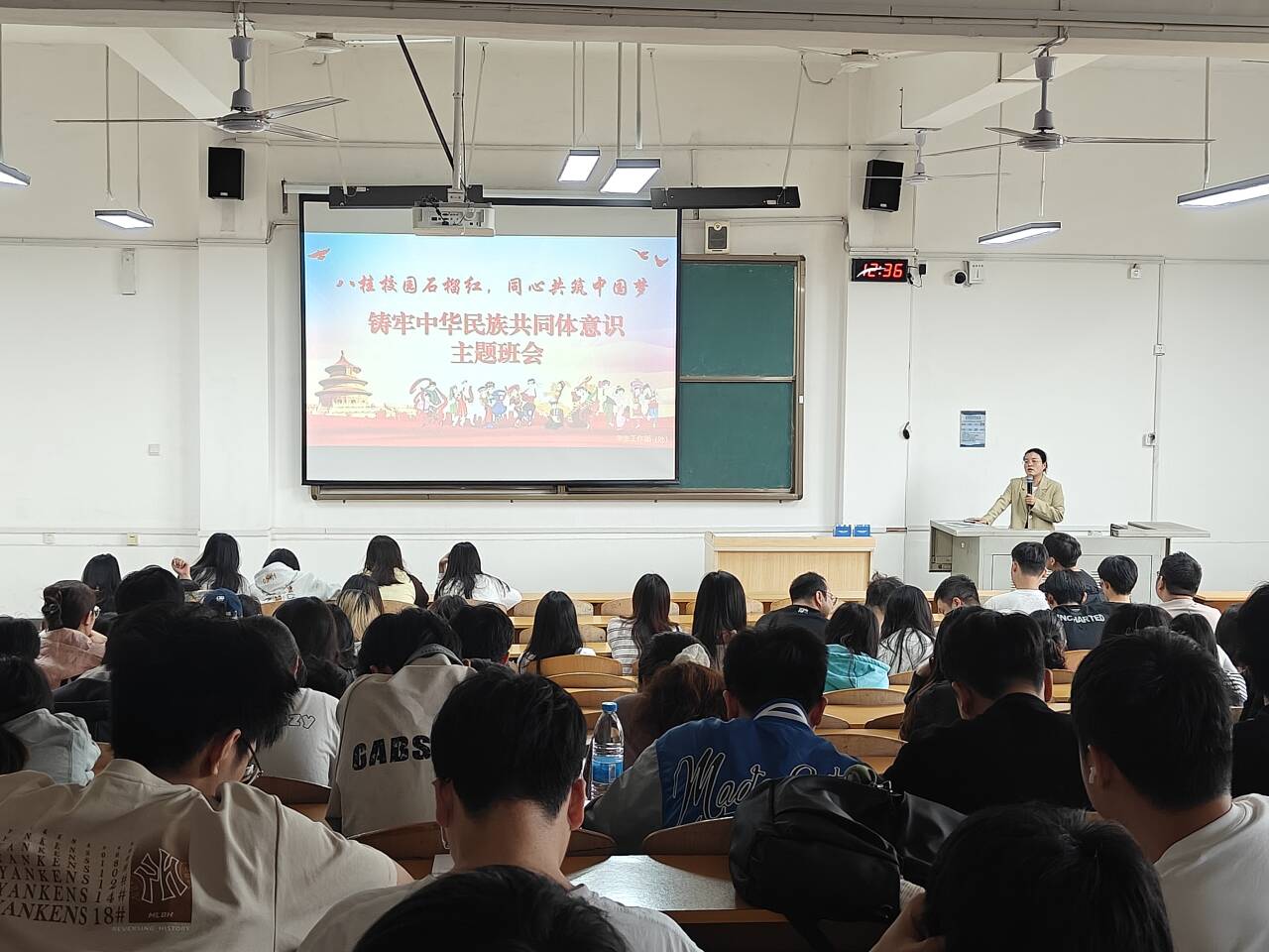 班会上,辅导员以我国统一多民族国家的基本国情为切入点,结合歌曲《爱我中华》与民族分布图,生动讲解56个民族交往交流交融的历史脉络。围绕核心要义,辅导员系统解读铸牢中华民族共同体意识的重大理论与实践意义。指出铸牢中华民族共同体意识,就是要引导各族人民牢固树立休戚与共、荣辱与共、生死与共、命运与共的共同体理念。这一论断是对中华民族数千年发展历史的科学总结,是对新时代民族工作历史方位与使命任务的准确把握,也是“两个结合”在民族工作领域的重大实践,为新时代党的民族工作提供根本遵循。