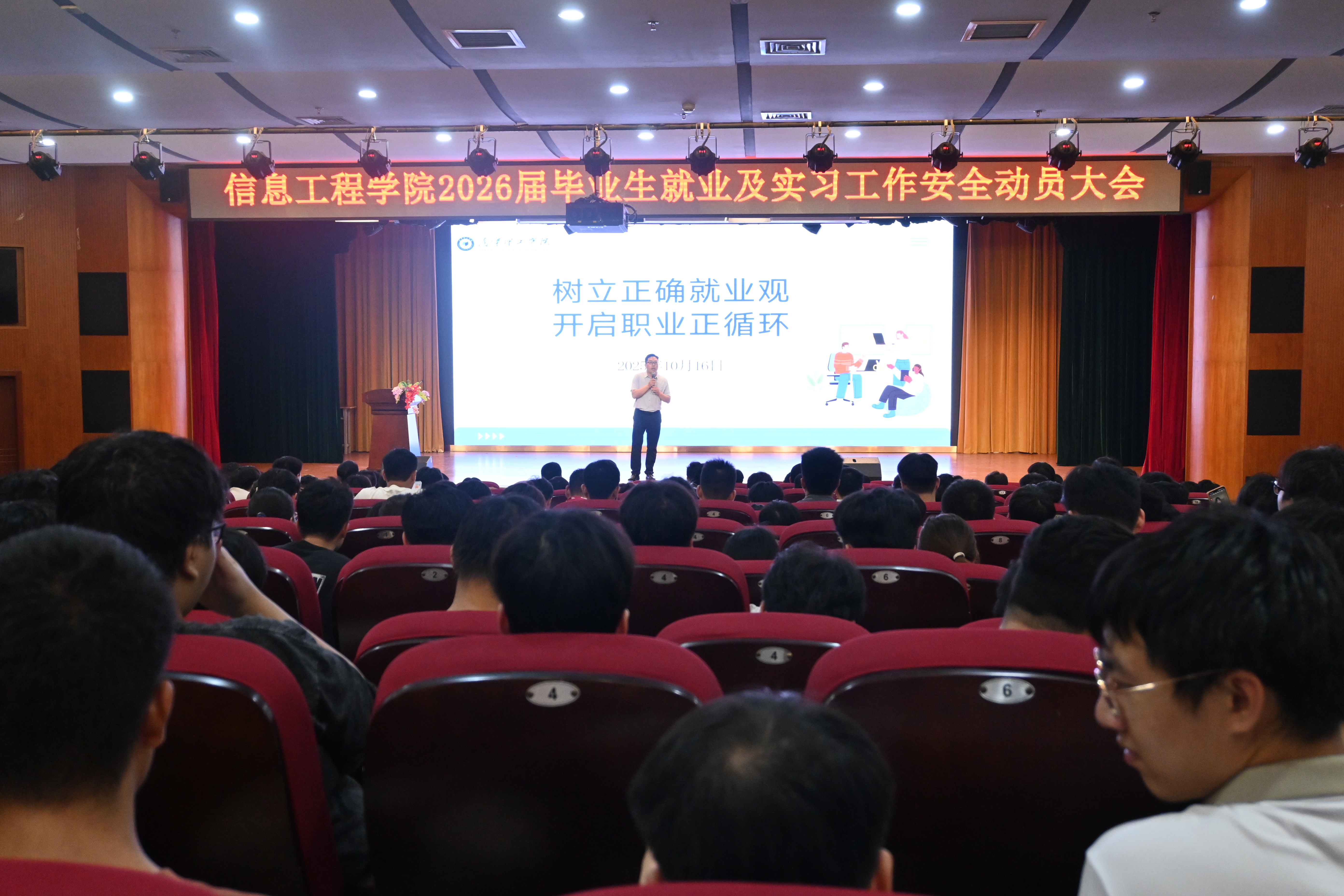 2025年10月16日,信息工程学院2026届毕业生就业及实习工作动员会在1626报告厅顺利召开。学院党总支书记王帅主讲,2026届电气工程及其自动化(专升本)专业全体毕业生参会。会议紧扣“明晰方向、树正观念、守牢安全”主线,旨在帮助毕业生认清就业形势、找准职业路径,破除就业认知误区,为开启职业发展正循环筑牢根基。