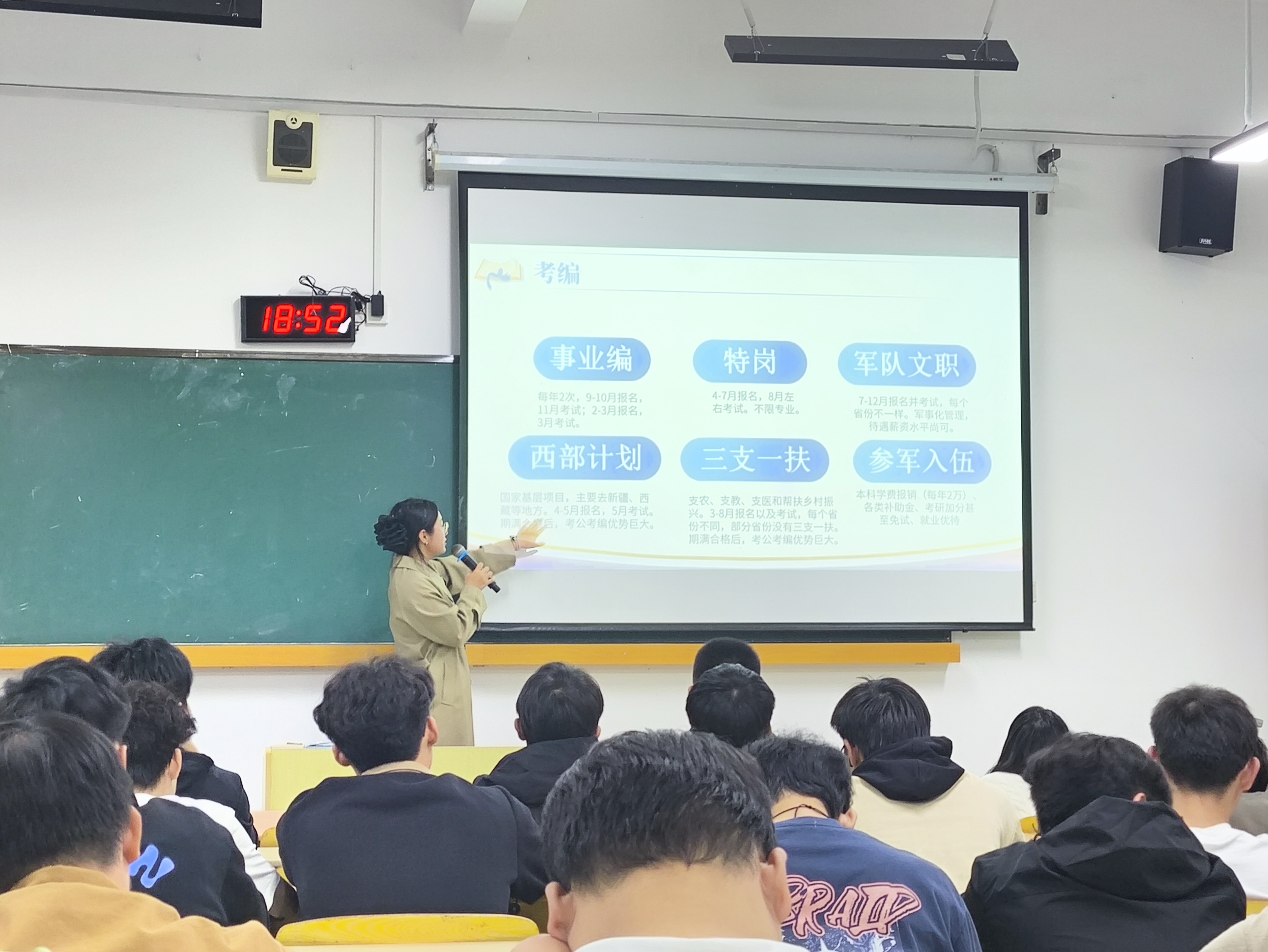 首先,洪绮哲老师从职业生涯规划的长远视角切入,结合当前就业市场趋势与行业发展需求,向同学们阐释了基层就业在职业成长中的重要意义。她指出,基层是青年成长的 “练兵场”,不仅能积累实践经验、锤炼综合能力,更能为职业生涯奠定坚实基础,鼓励同学们打破就业认知局限,将基层就业纳入职业规划的重要考量。随后,她聚焦 “三支一扶” 计划展开重点解读,结合人力资源社会保障部最新政策要求,详细介绍了支教、支农、支医和帮扶乡村振兴四大岗位类别,同时梳理了报名流程、考试重点、关键时间节点,特别提醒退役大学生士兵笔试加分及服务期满后公务员定向考录、考研加分等优待政策,并结合学院专业特色推荐了基层技术服务、乡村振兴帮扶等适配岗位。在互动环节中,洪绮哲老师耐心解答了同学们关于岗位分配、户籍限制、备考方向等疑问。
