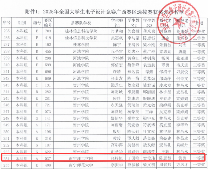 近日,2025年全国大学生电子设计竞赛广西赛区选拔赛暨广西大学生电子设计竞赛圆满落幕。经过激烈角逐,南宁理工学院代表队在比赛中表现优异,荣获本科组自治区级一等奖一项,充分展现出扎实的专业基础、出色的创新能力和团队协作精神。