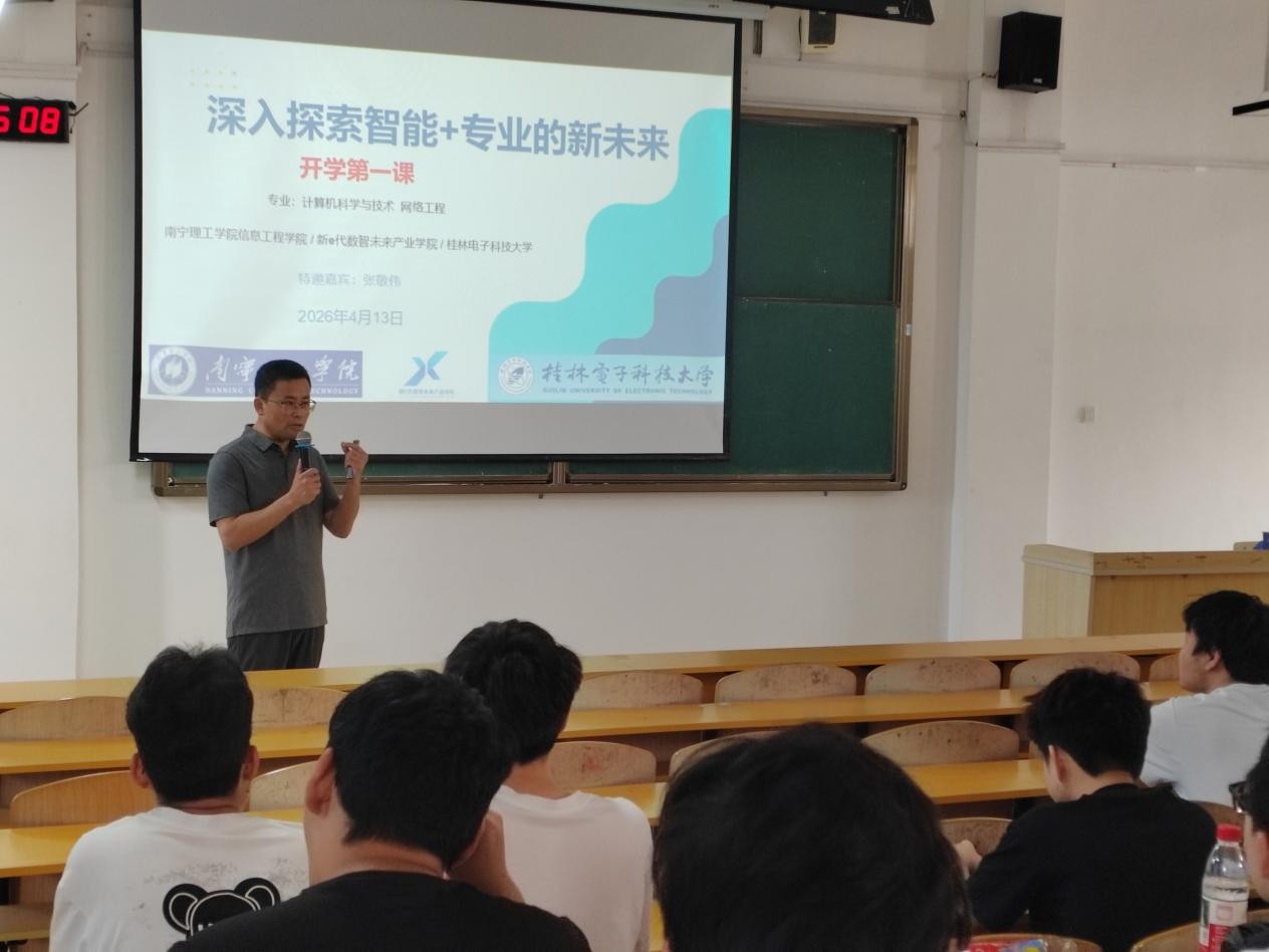 为紧跟人工智能技术发展浪潮,推动计算机科学与技术、网络工程、电气工程及其自动化与 AI 深度融合,帮助学子明晰行业趋势、规划职业蓝图,2026 年 4 月 13 日,南宁理工学院信息工程学院/新e代数智未来产业学院成功举办 “深入探索智能 + 专业的新未来” 开学第一课专题讲座。本次讲座特邀学校教学名师、广西模范教师张敬伟教授主讲,学院相关专业学生齐聚现场,共赴一场智能技术与专业发展的思想盛宴。